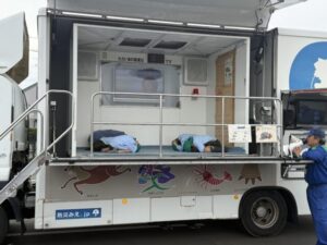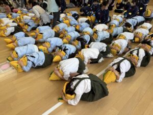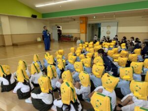 11月13日の様子 2025.11.18 避難訓練をしました。地震発生と放送が入り、お部屋で身を守った後ホールに避難しました。 今回は防災推進課の方にも来てもらい、避難のアドバイスをいただきました。 みんなでダンゴムシポーズも練習しました。 そのあとは地震体験車に乗って大きな揺れを体験しました。 震度6は、ものすごい揺れで地震の怖さを体験することができました。